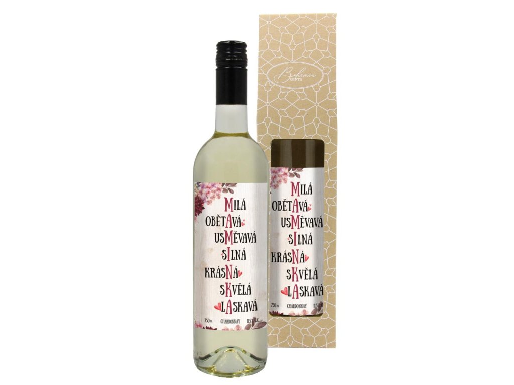 Dárkové bílé víno Chardonnay 0,75 l s unikátní etiketou, balené v dárkové krabičce. Skvělý dárek k narozeninám, svátku nebo jen tak pro radost.