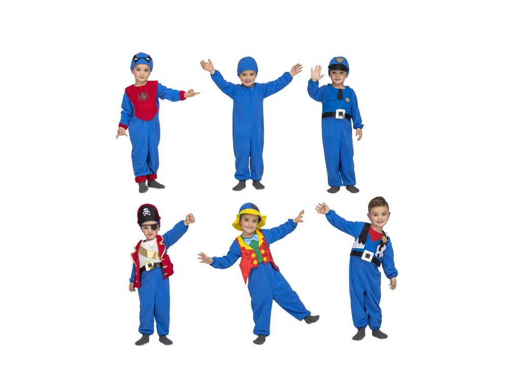 Univerzální dětský kostým 5 v 1 v modré barvě. Díky doplňkům se dítě může proměnit v šerifa, piráta, Spidermana, klauna nebo policistu.