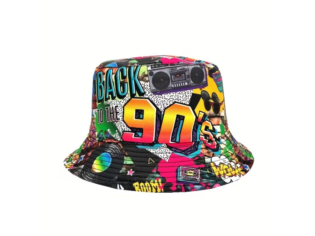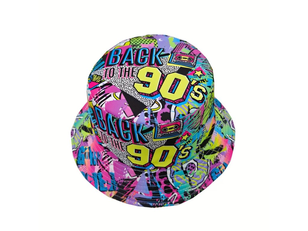Tento klobouk ve stylu 90. let s nápisem BAck to 90s je dokonalým doplňkem pro každého, kdo chce oživit atmosféru této ikonické dekády. Barevný design a pohodlný střih zajistí, že budete na párty nepřehlédnutelní.
