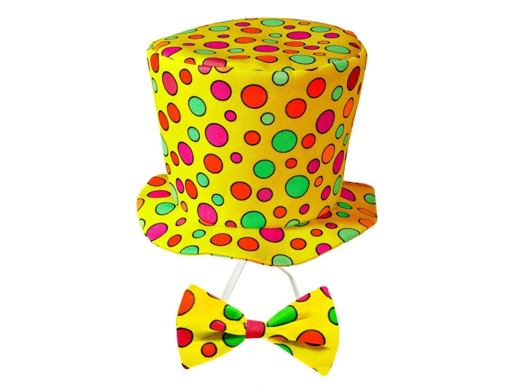 Klaunský klobouk a motýlek, dětská velikost. Potisk s puntíky.