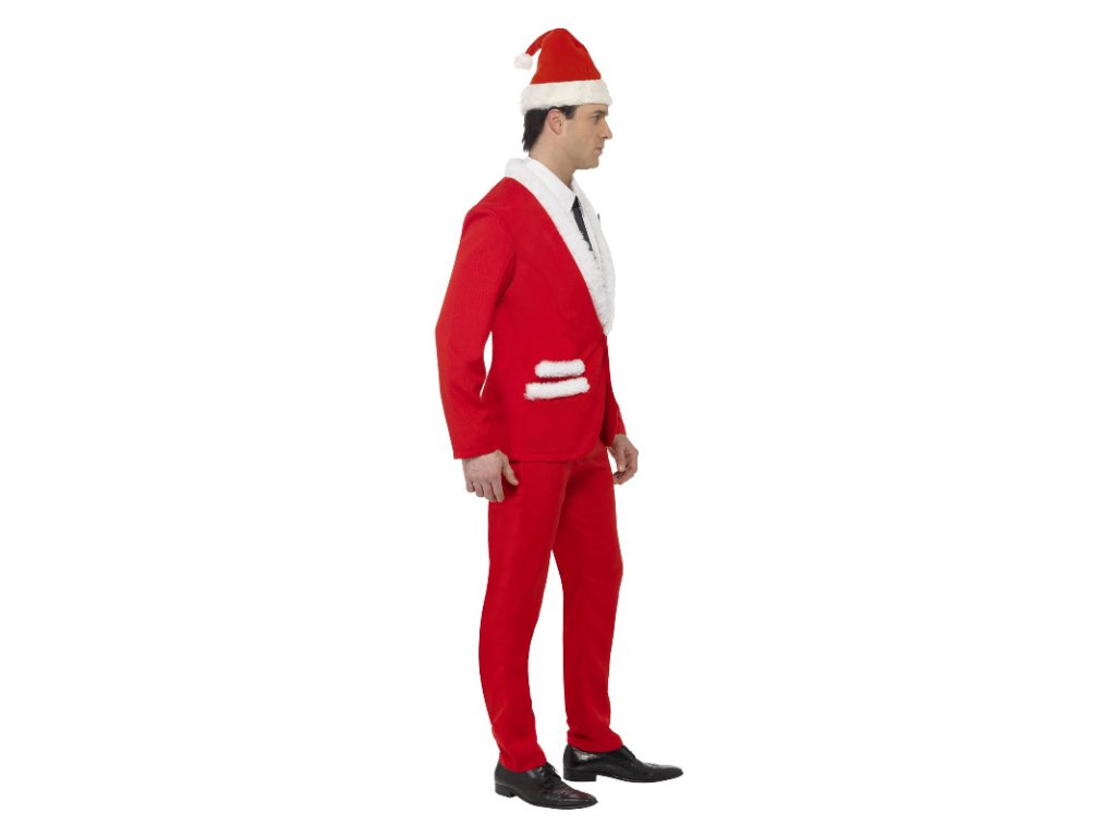 Klasický Santa Claus kostým obsahuje sako, kalhoty, falešná košile s kravatou a čepice – vše potřebné pro vánoční kouzlo!