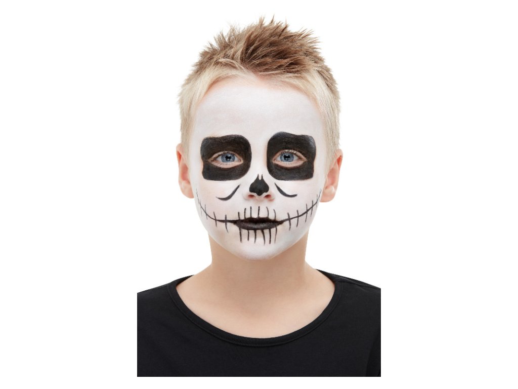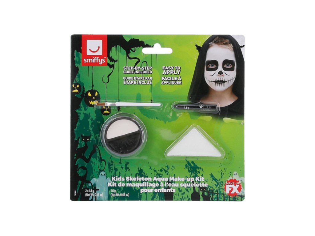 Proměň se v děsivého kostlivce během pár minut! Sada líčidel obsahuje černou, bílou barvu, štěteček, černou pastelku a houbičku. Perfektní na party i karneval.