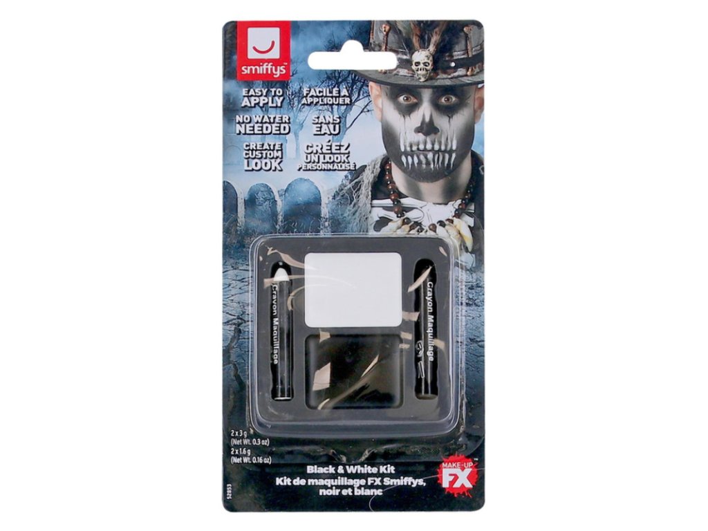 Proměň se v děsivého kostlivce během pár minut! Sada líčidel obsahuje černou, bílou barvu, černou a bílou pastelku. Perfektní na party i karneval.