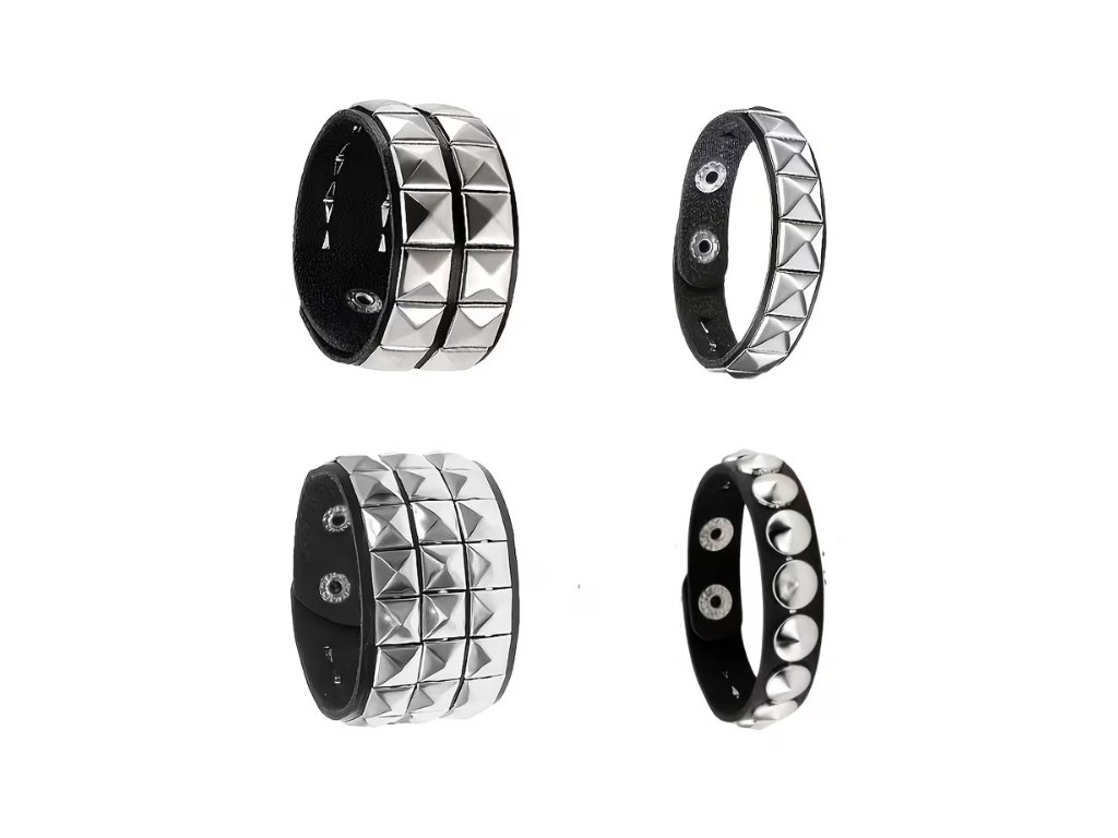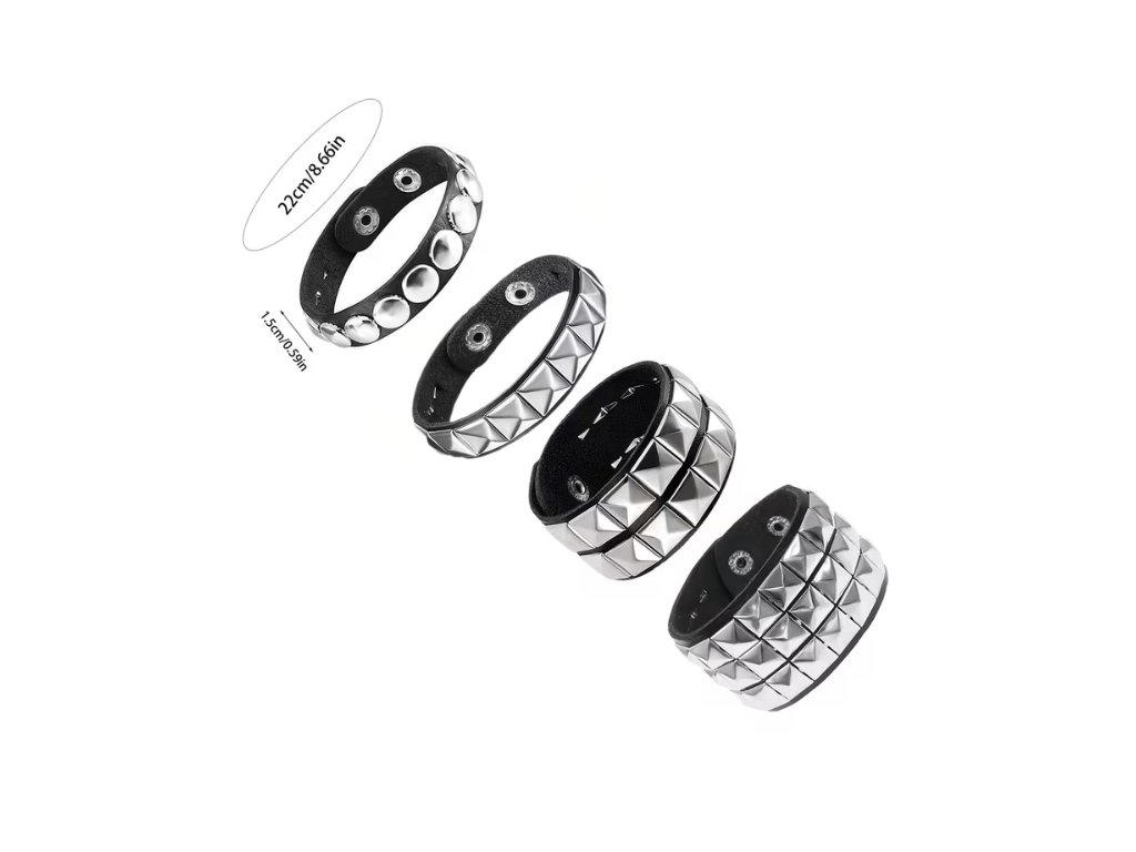 Stylový set 4 kožených punk náramků s cvoky dodá každému outfitu drsný rockový šmrnc! Perfektní na retro párty, koncerty i běžné nošení.