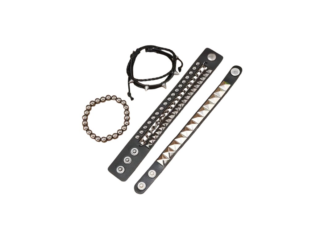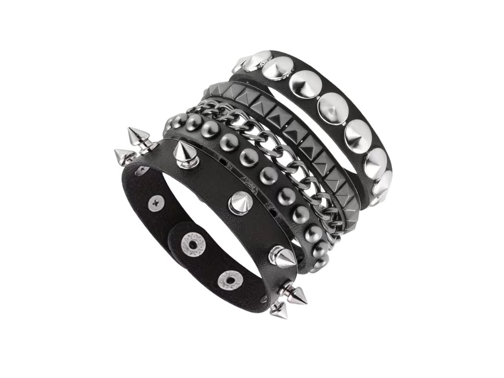 Stylový set 4 kožených punk náramků s cvoky dodá každému outfitu drsný rockový šmrnc! Perfektní na retro párty, koncerty i běžné nošení.