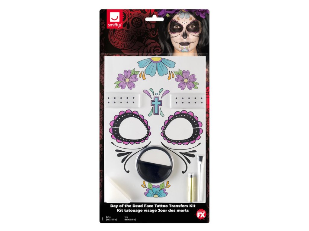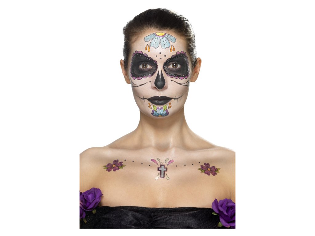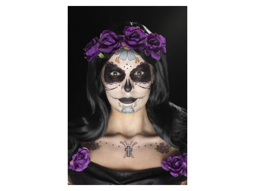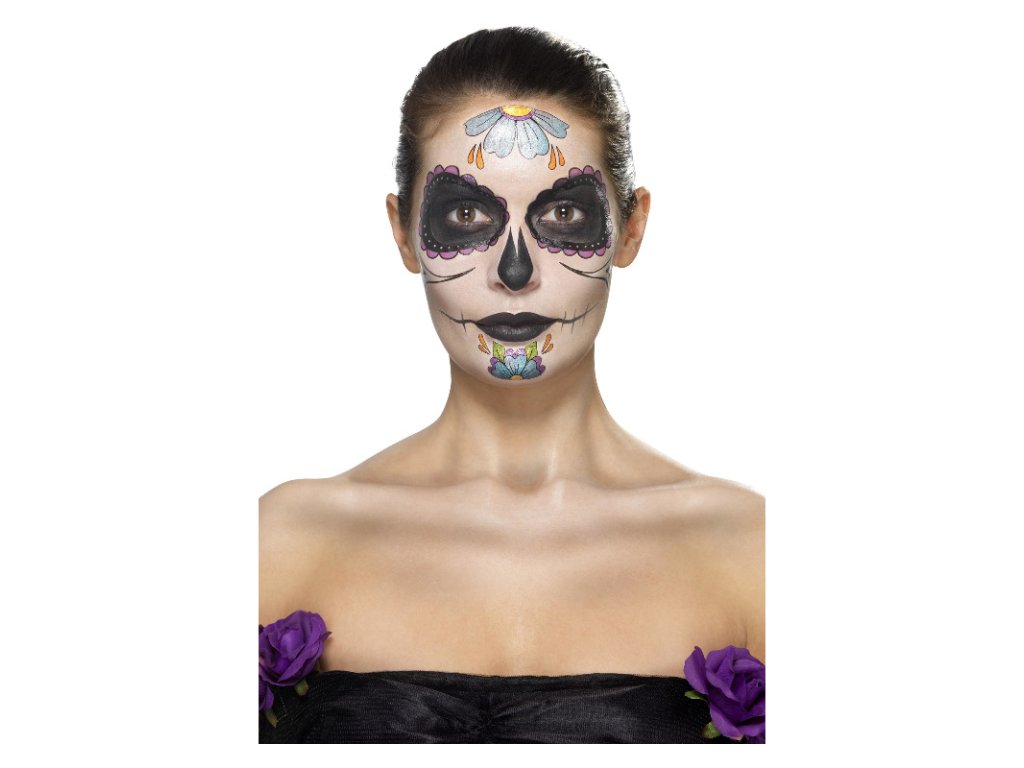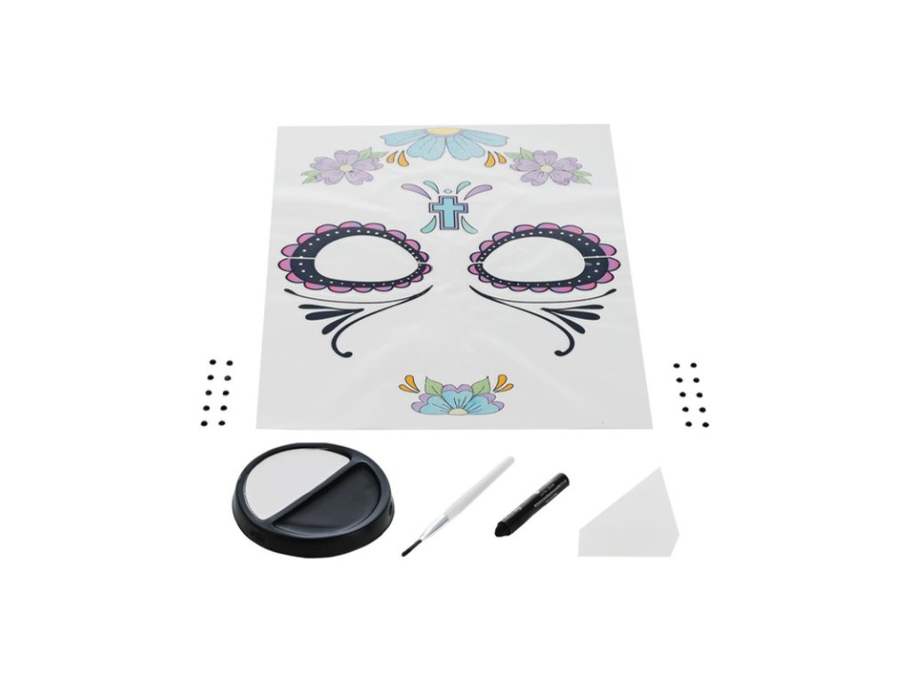 Sada obsahuje make-up, tetování, kamínky, štěteček, pastelku a houbičku.