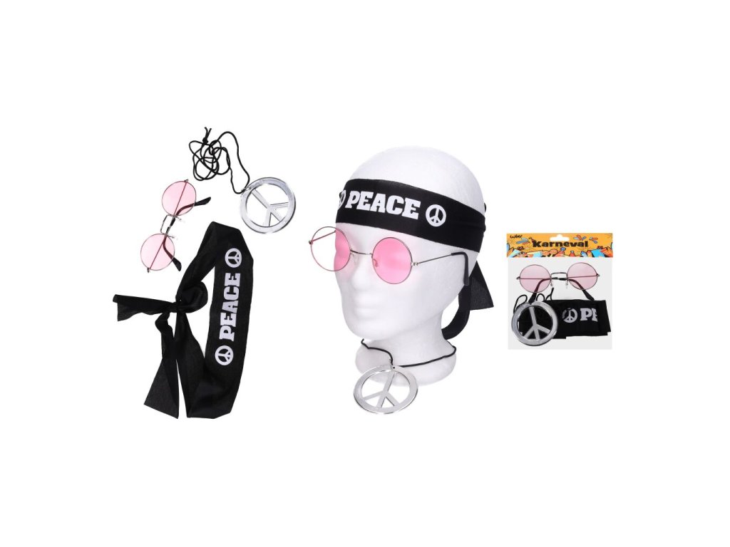 Obsahuje čelenku s výrazným nápisem "Peace", růžové kulaté brýle a stříbrný náhrdelník s typickým hippie symbolem míru.