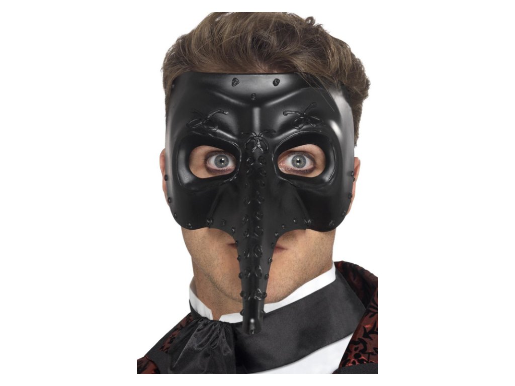 Maska benátská dlouhý nos, černá, tvrdý plast.