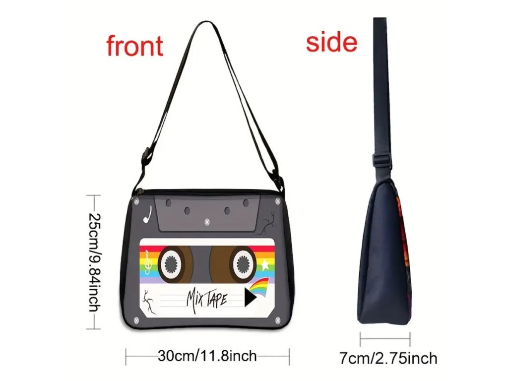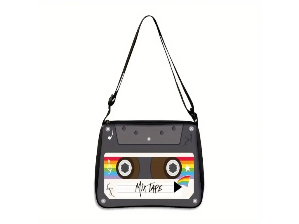 Stylová taška přes rameno ve tvaru retro kazety do kazeťáku! Ideální na 80's party, festival nebo jen tak pro milovníky vintage stylu. Uzavíratelná na zip.