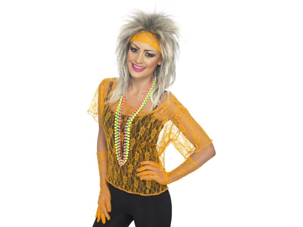 Stylová krajková sada v oranžové barvě, která dodá vašemu outfitu autentický osmdesátkový vzhled.