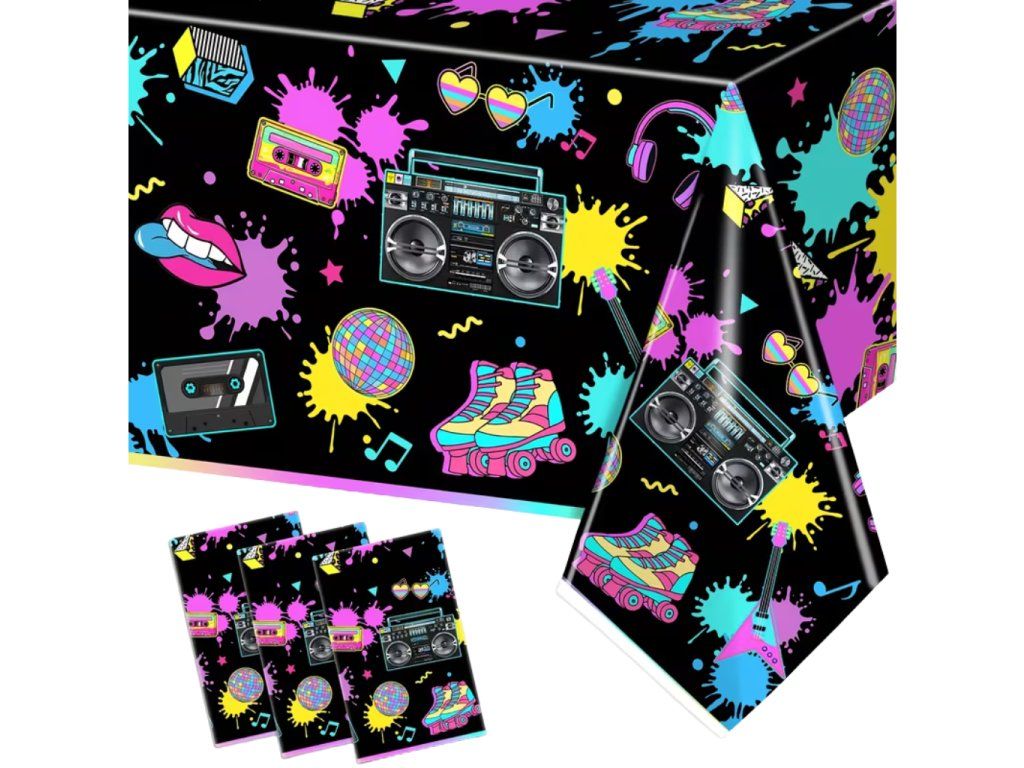 🎉 Tip: Přidejte k ubrusu i barevné kelímky, kazetový přehrávač jako dekoraci a zapněte playlist s hity jako "Ice Ice Baby" nebo "Wannabe". Ať je to pravá devadesátková jízda!